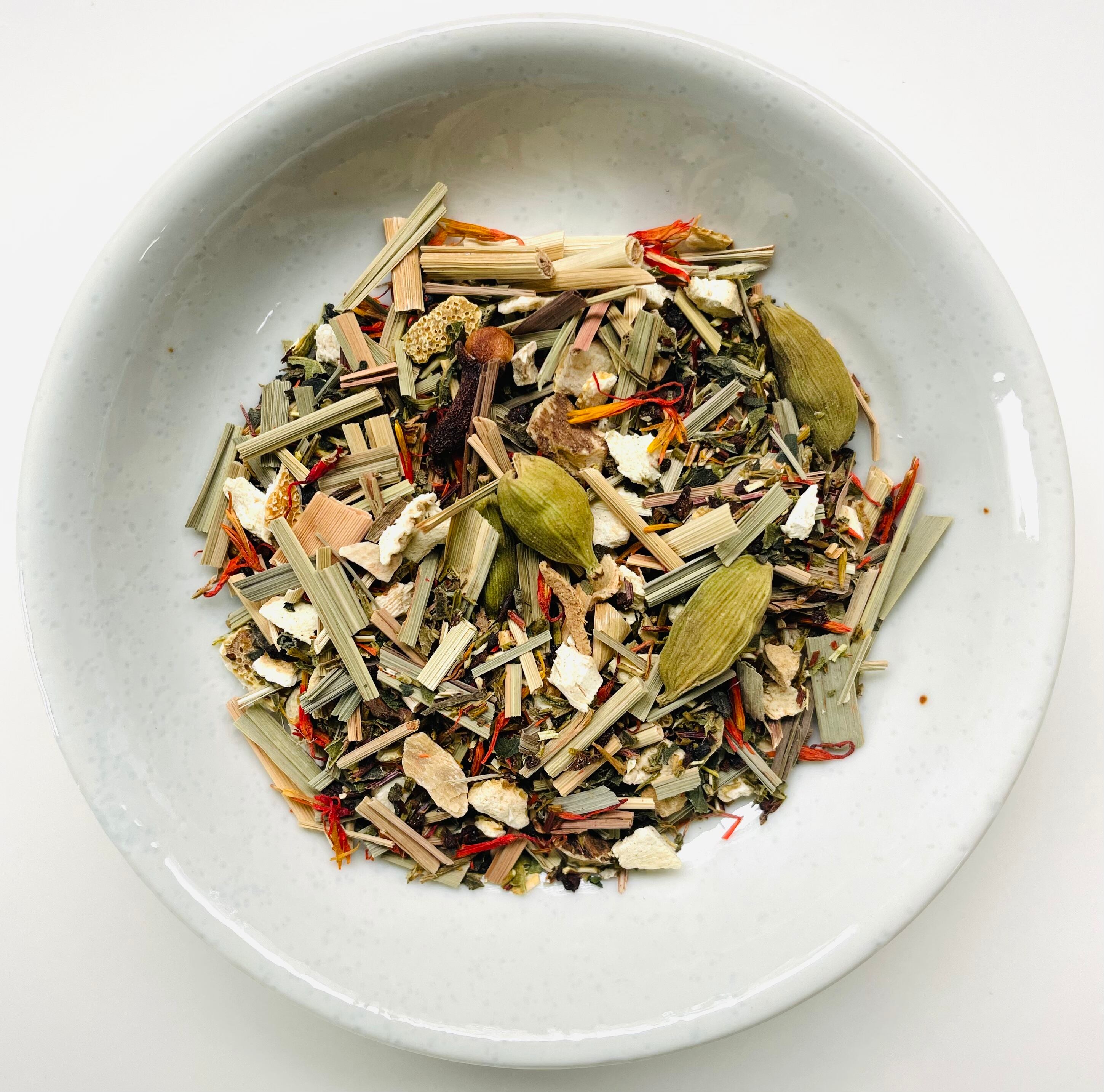 有機ルイボスレッド(南アフリカ産)、有機レモングラス(エジプト産)、ダンディライオン(ポーランド産).チコリロースト(フランス産)、ジンジャー(中国産)、有機オレンジピール(タンザニア産)、ネトル(ブルガリア産)、カルダモン(インド産)、グローブ(マレーシア産)、シナモン(ベトナム産)、サフラン(中国)